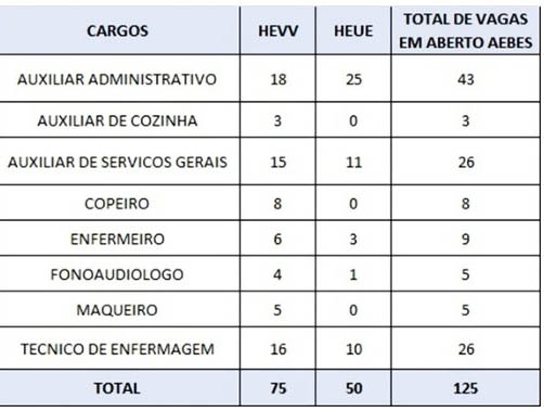 Confira, abaixo, as vagas de emprego em oferta no HEVV e no HEUE: