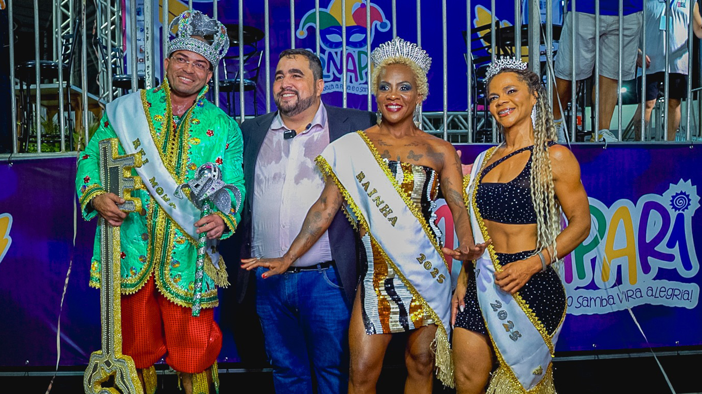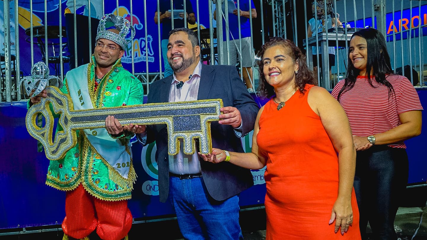 Um dos momentos mais marcantes da noite foi a entrega simbólica da chave da cidade ao Rei Momo pelo prefeito, Rodrigo Borges, dando início oficial à folia.