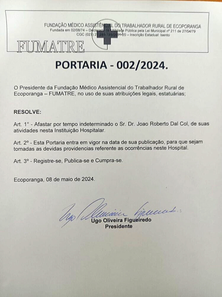 Após o ocorrido, Dr. João Roberto Dal’Col foi afastado de suas funções no hospital.