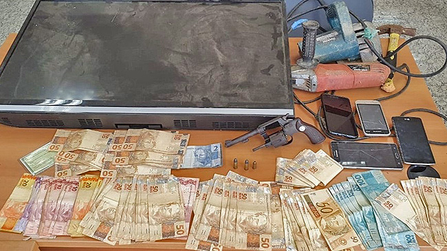 Durante a ação na casa de R.S.Z., os policiais localizaram um revólver calibre 22, cinco munições – sendo uma intacta e quatro picotadas, R$ 420,00 e diversos objetos sem nota fiscal.  Já na residência de N.A.W. foi apreendido um tablete de maconha e R$ 400,00.   Por fim, na residência de R. K. A., de 22 anos, os policiais localizaram a quantia de R$ 7 mil. “Os três maiores de idade são apontados como suspeitos de uma tentativa de homicídio, ocorrida no último dia 16, no município, cuja motivação é a disputa pelo controle do tráfico de drogas na região. O último suspeito ainda está foragido”, disse o responsável pela DP, delegado Rafael Amaral.