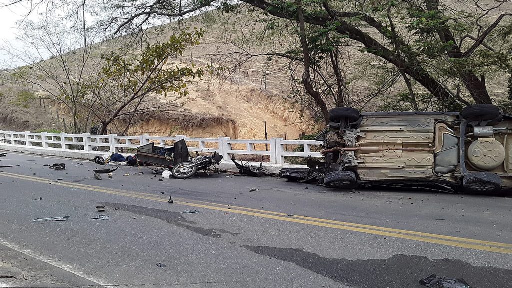 O acidente envolveu um carro, um Voyage preto, e uma moto, onde tinham três ocupantes da mesma família.