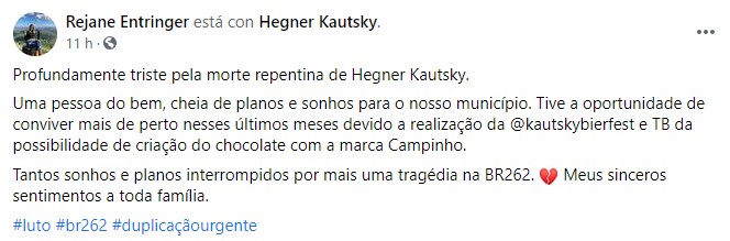 Morreu na noite deste domingo (17) o empresário Hegner Kautsky, de 54 anos, vítima de um grave acidente que ocorreu no mesmo dia, na BR 262 (curva da morte), altura do distrito de Santa Isabel, em Domingos Martins.