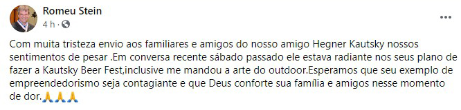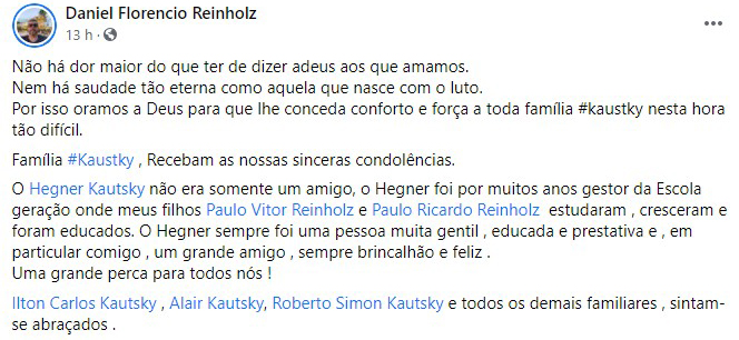 O velório de Hegner Kautsky acontece nesta segunda-feira (18), às 15h., na Capela anexa ao Hospital de Domingos Martins. O sepultamento será às 17h, em Santa Isabel.