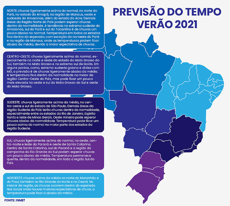 Em 2021, o brasileiro pode esperar um verão quente e chuvoso. Segundo a meteorologista Nayane Araujo, do Instituto Nacional de Meteorologia, o fenômeno La Niña contribui para a previsão de chuvas ligeiramente acima da média, na maior parte do País, com temperaturas elevadas.
