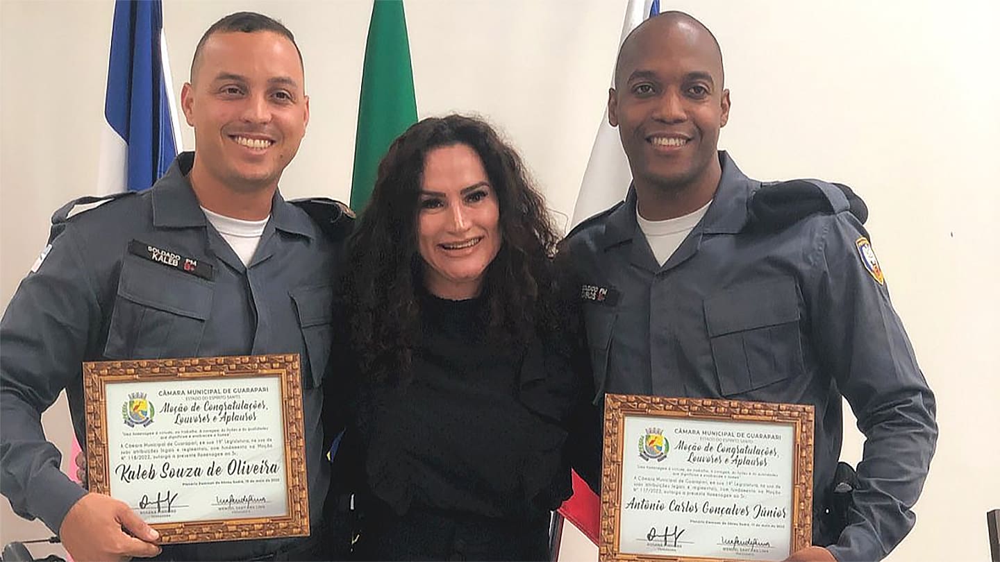 Na oportunidade, os policiais Antônio Carlos Gonçalves Júnior e Kaleb Souza de Oliveira receberam uma Moção de Congratulações, Louvores e Aplausos da vereadora Rosana Pinheiro.