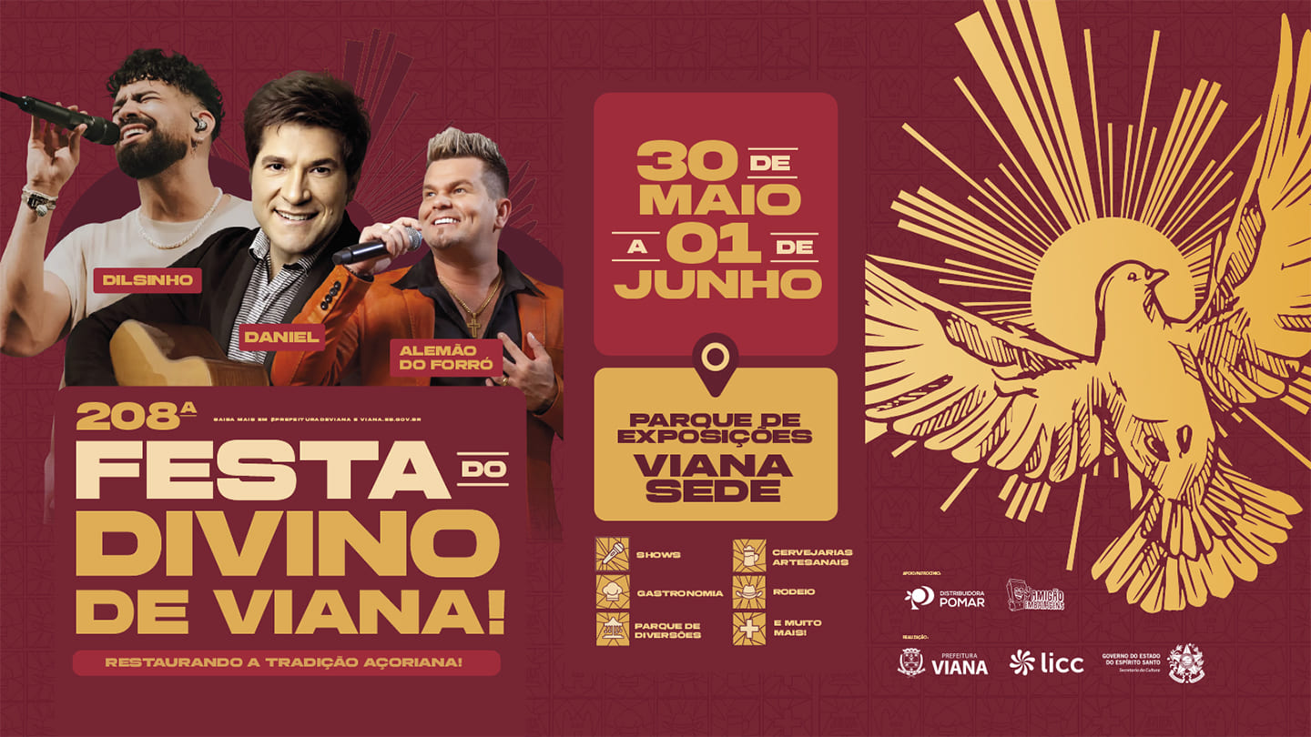 A Festa do Divino chega à sua 208ª edição com tudo o que o vianense ama: fé, tradição, música boa e muita alegria! De 30 de maio a 1º de junho, o Parque de Exposições de Viana Sede será o palco da festa popular desta, que é uma das maiores celebrações do Espírito Santo, reunindo atrações nacionais, rodeio, parque de diversões, feira de empreendedores e um clima festivo para toda a família!