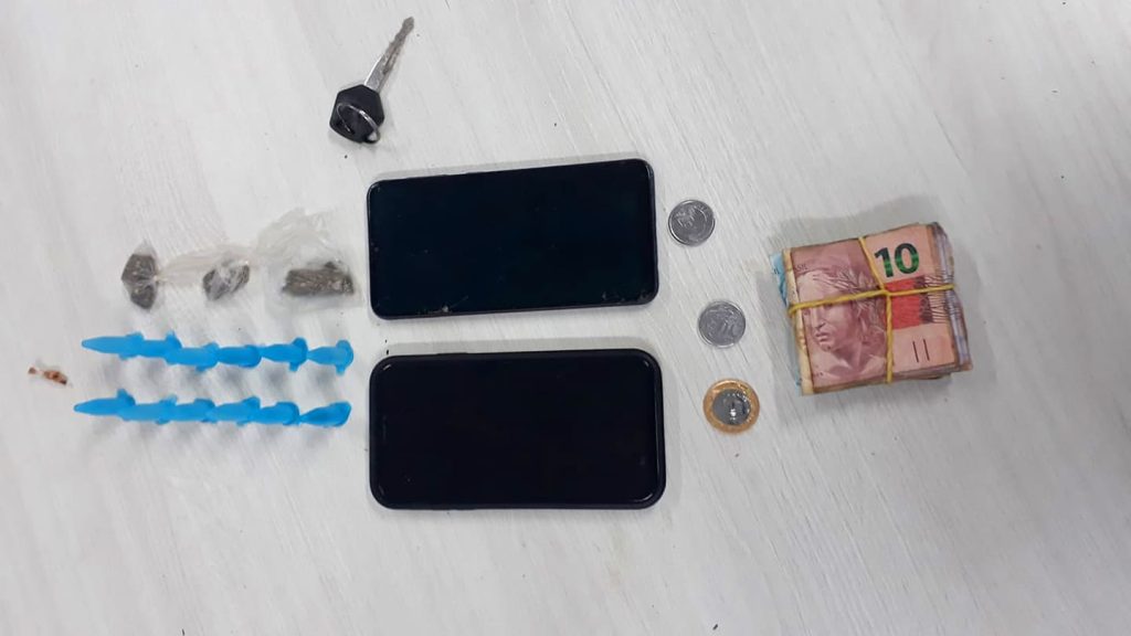 Os guardas municipais, então, abordaram os outros três indivíduos. Durante a revista foram encontrados 12 pinos de substância de cocaína, três buchas de maconha, uma pedra de crack, uma quantia em dinheiro no valor R$ 395,00 e dois celulares.