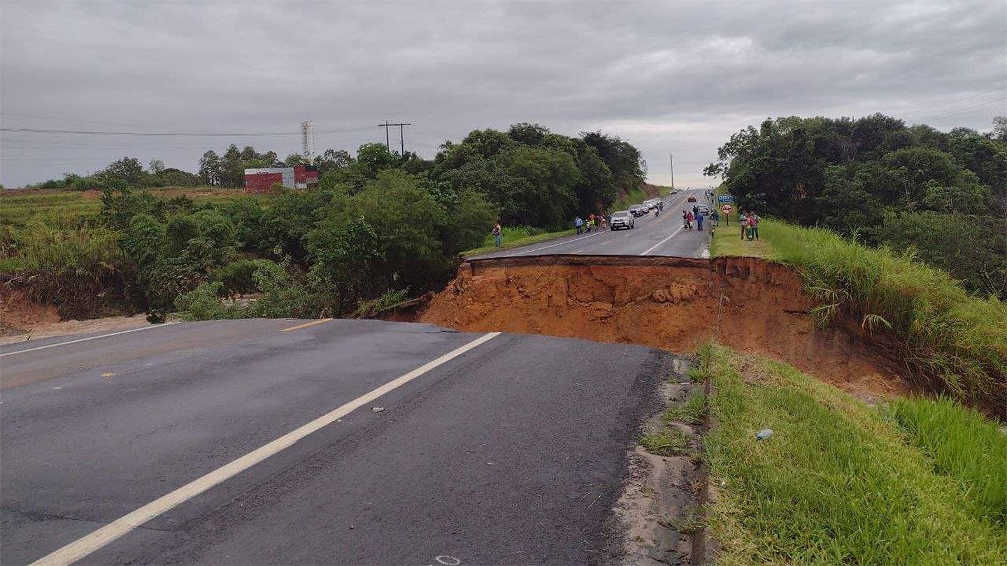 De acordo com a Polícia Rodoviária Federal (PRF), a pista está totalmente interditada em virtude da erosão.