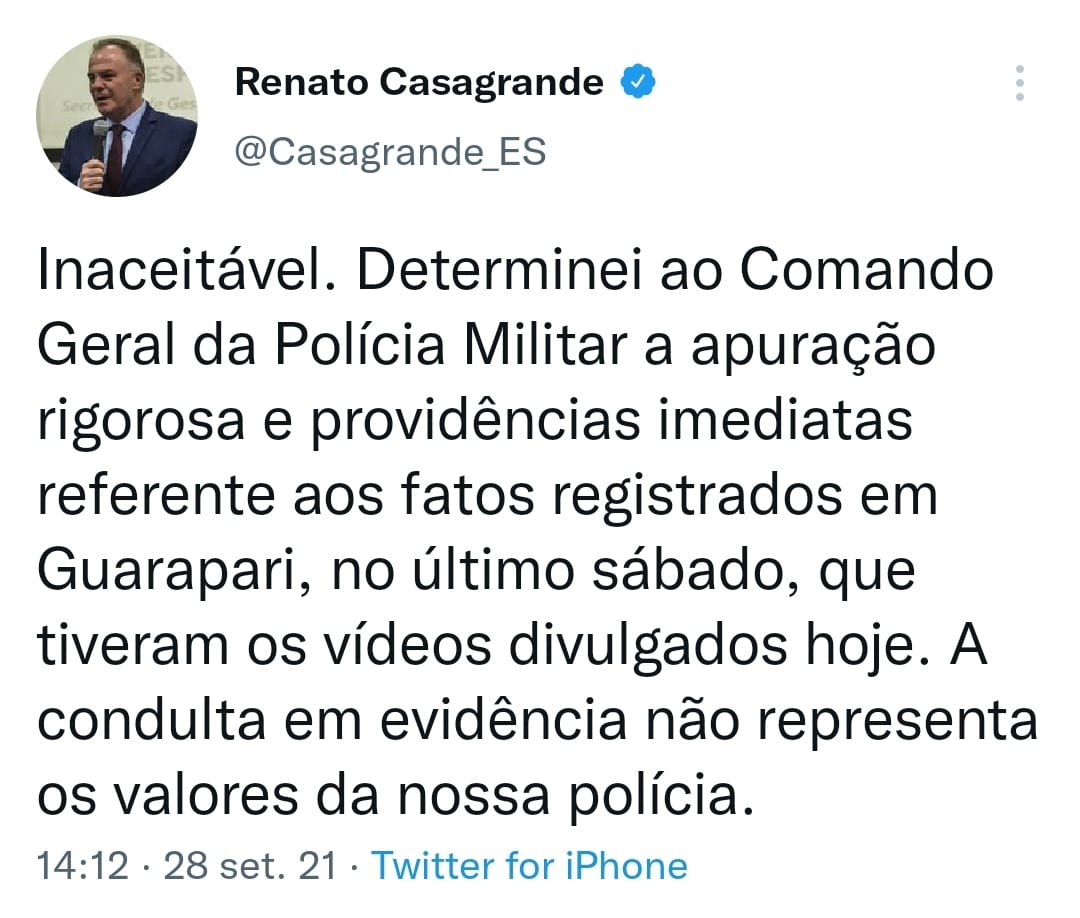 Em uma rede social, o governador Renato Casagrande divulgou uma mensagem classificando a ação do policial como “inaceitável”.