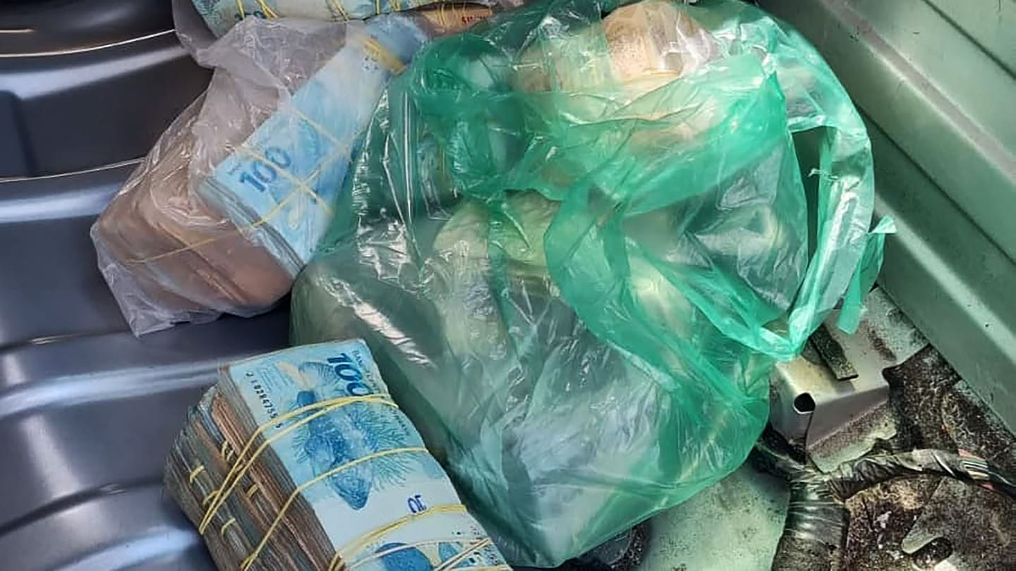 Ao efetuar vistorias no interior do veículo, os policiais localizaram um fundo falso. Ao abrir foi encontrada uma grande quantidade de dinheiro, totalizando R$ 410.000,00.