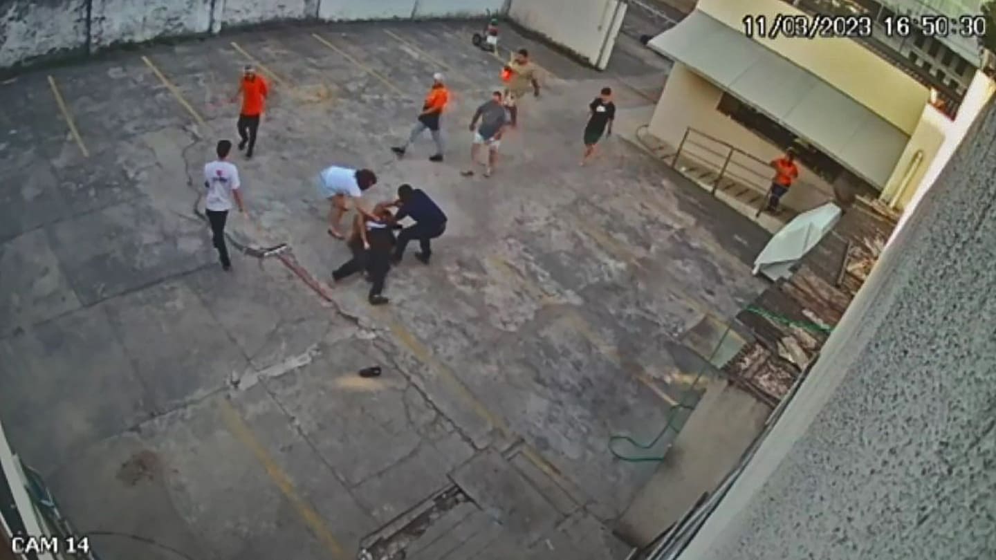 Nas imagens gravadas por câmaras de segurança é possível ver que o homem entra no comércio e ao tentar sair pelos fundos, no estacionamento, agarra um mulher quando chega várias pessoas para ajudá-la.