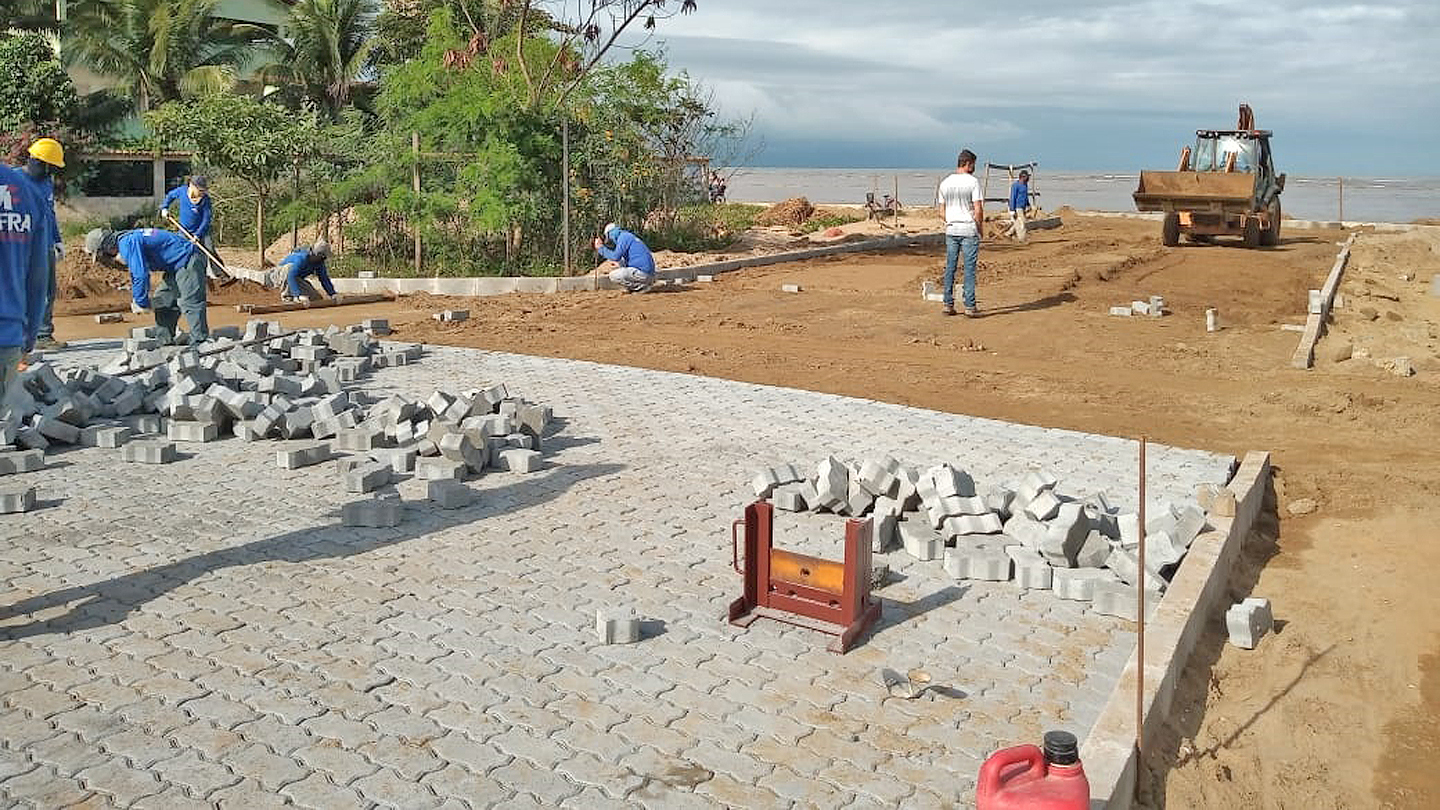 Vila Samarco: muro concluído e ruas recebendo pavimentação em Anchieta