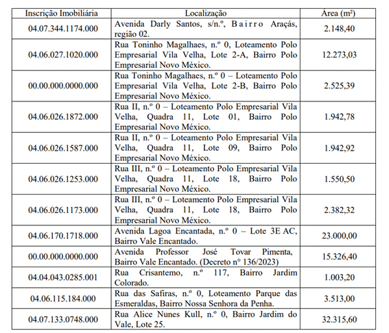 Os imóveis a serem desafetados, alienados, avaliados e licitados pelo município são: