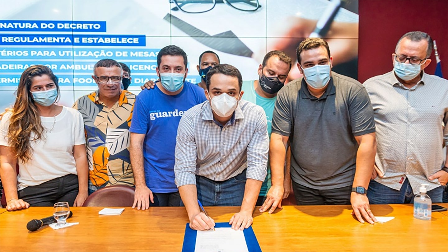 Dois decretos que vão estimular o desenvolvimento da atividade econômica e a geração de renda, com ganho social. O prefeito Lorenzo Pazolini assinou, na tarde deste 17 de julho, Dia do Comerciante, o Decreto 19.712, que autoriza e estabelece critérios para utilização de mesas, cadeiras ou bancos em passeios públicos ou praças por ambulantes licenciados. Assinou, ainda, o Decreto 19.704, que permitirá que os food trucks funcionem todos os dias da semana no mesmo local.